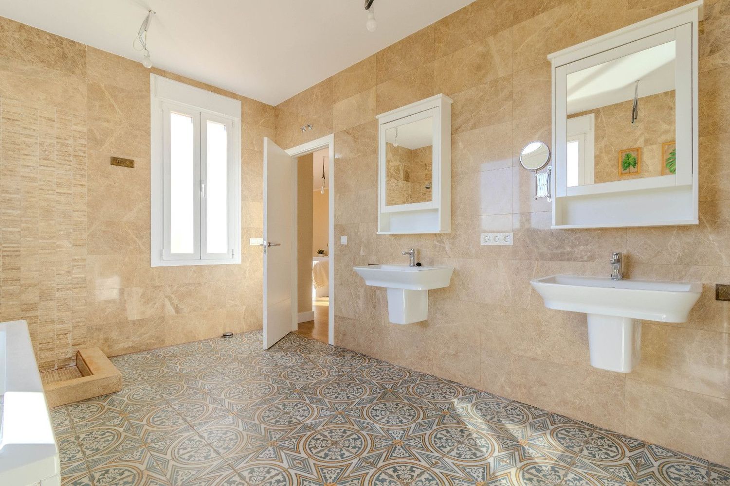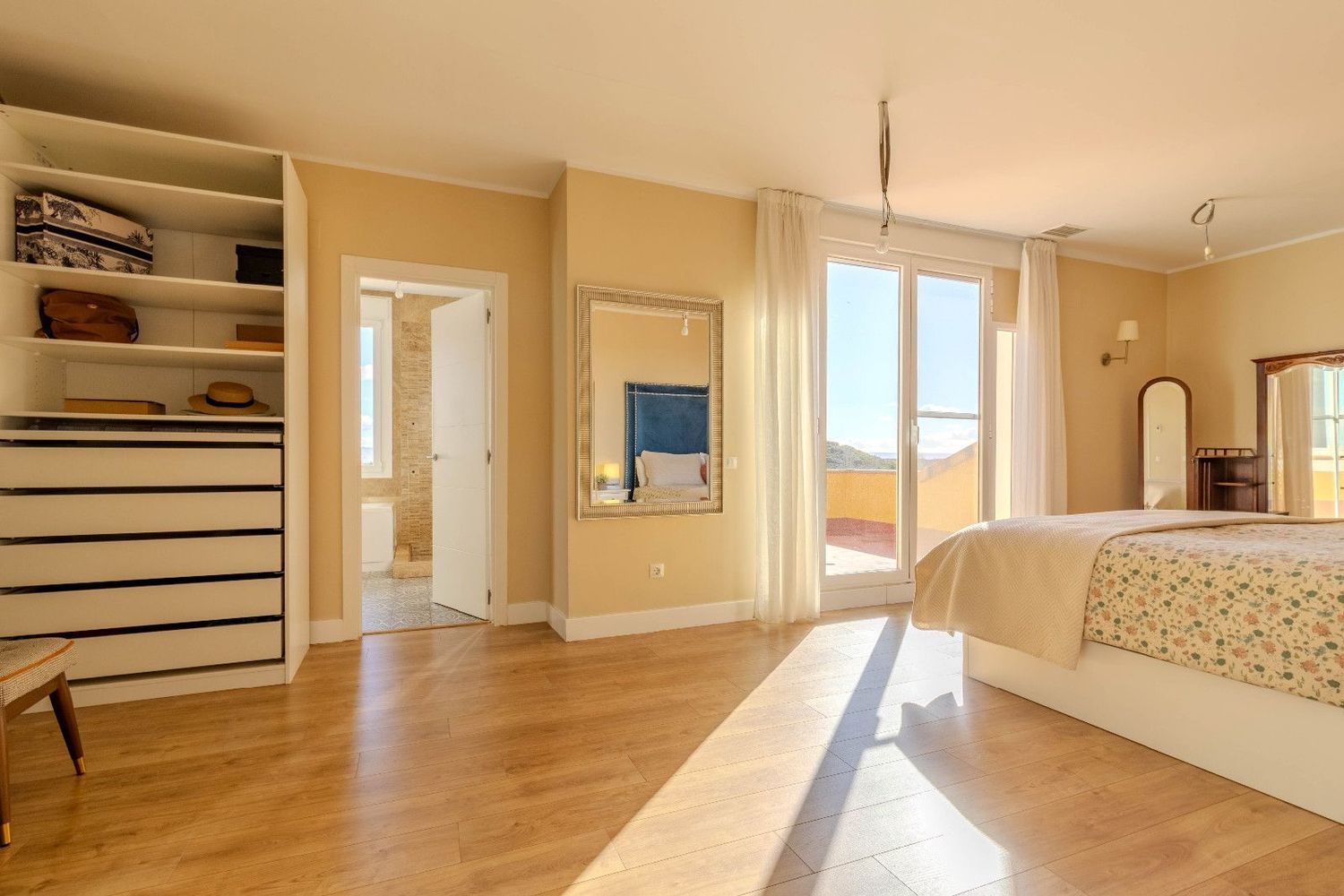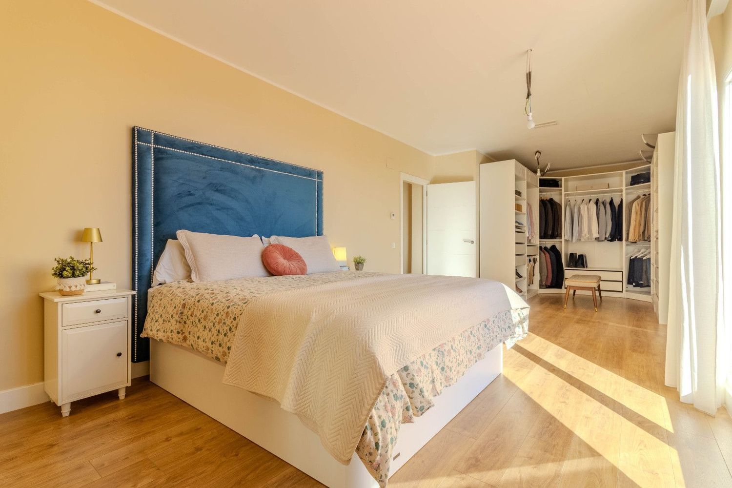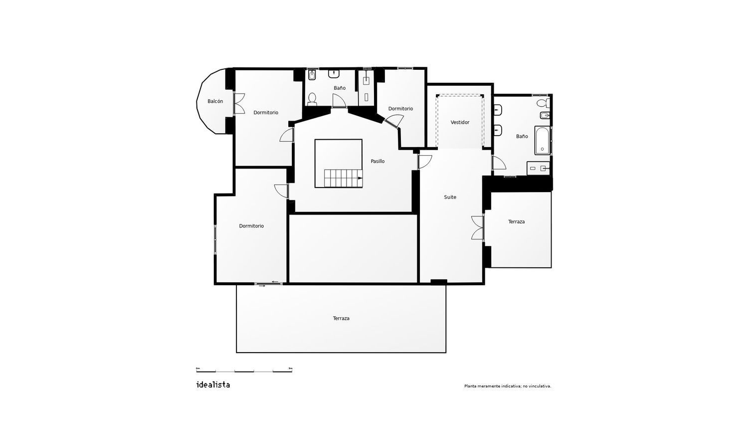 Planta primera: dormitorio principal con baño, estancia habilitada como vestidor, baño independiente y varios dormitorios adicionales, uno de ellos con acceso a terraza.