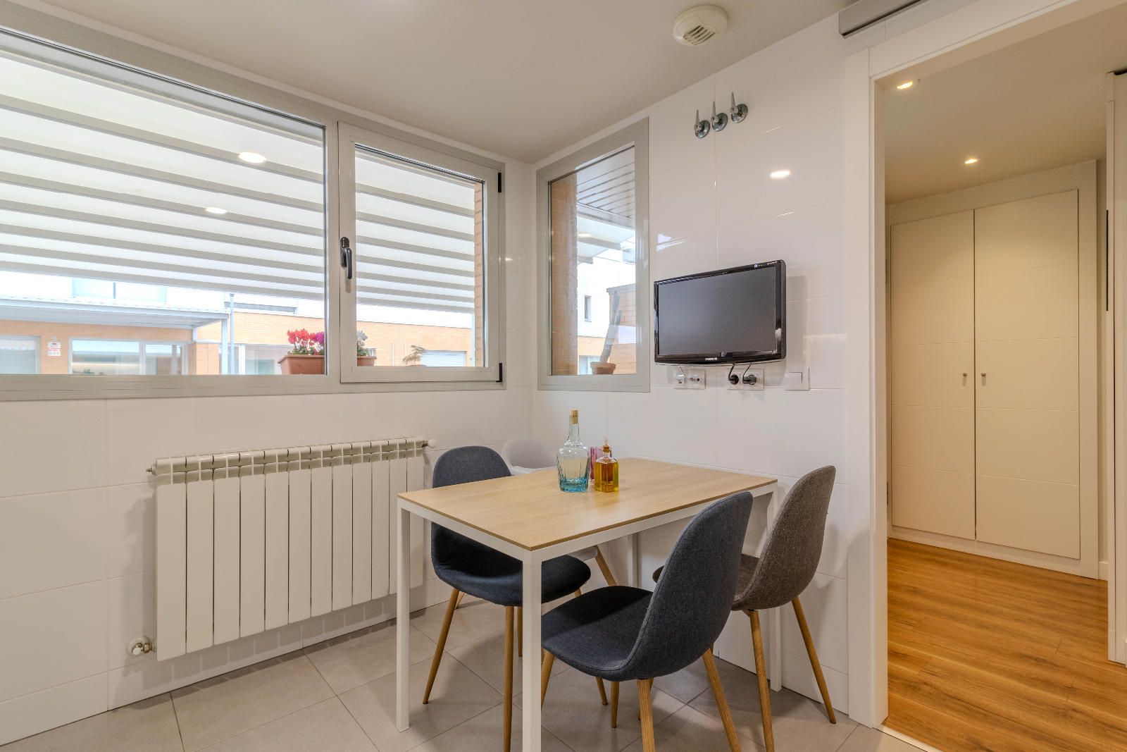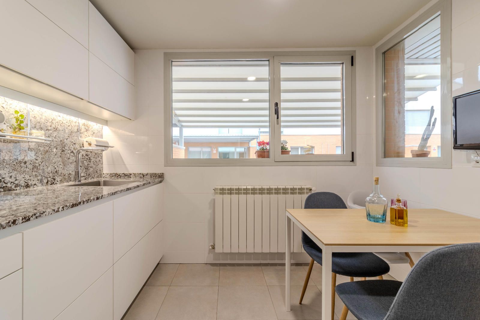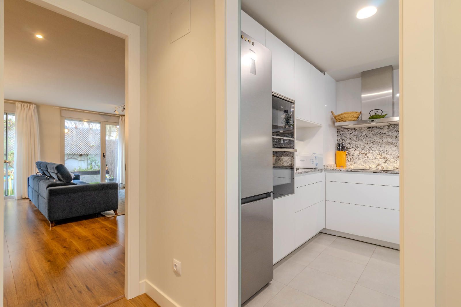 En la planta baja se encuentra un amplio salón con gran luminosidad, una cocina de diseño Santos (modelo Brezo) totalmente equipada, un baño completo, y un acogedor patio con césped artificial instalado en 2024, arriate con riego automático y toldo. La zona de aparcamiento está techada mediante un toldo motorizado que ofrece comodidad y protección durante todo el año.