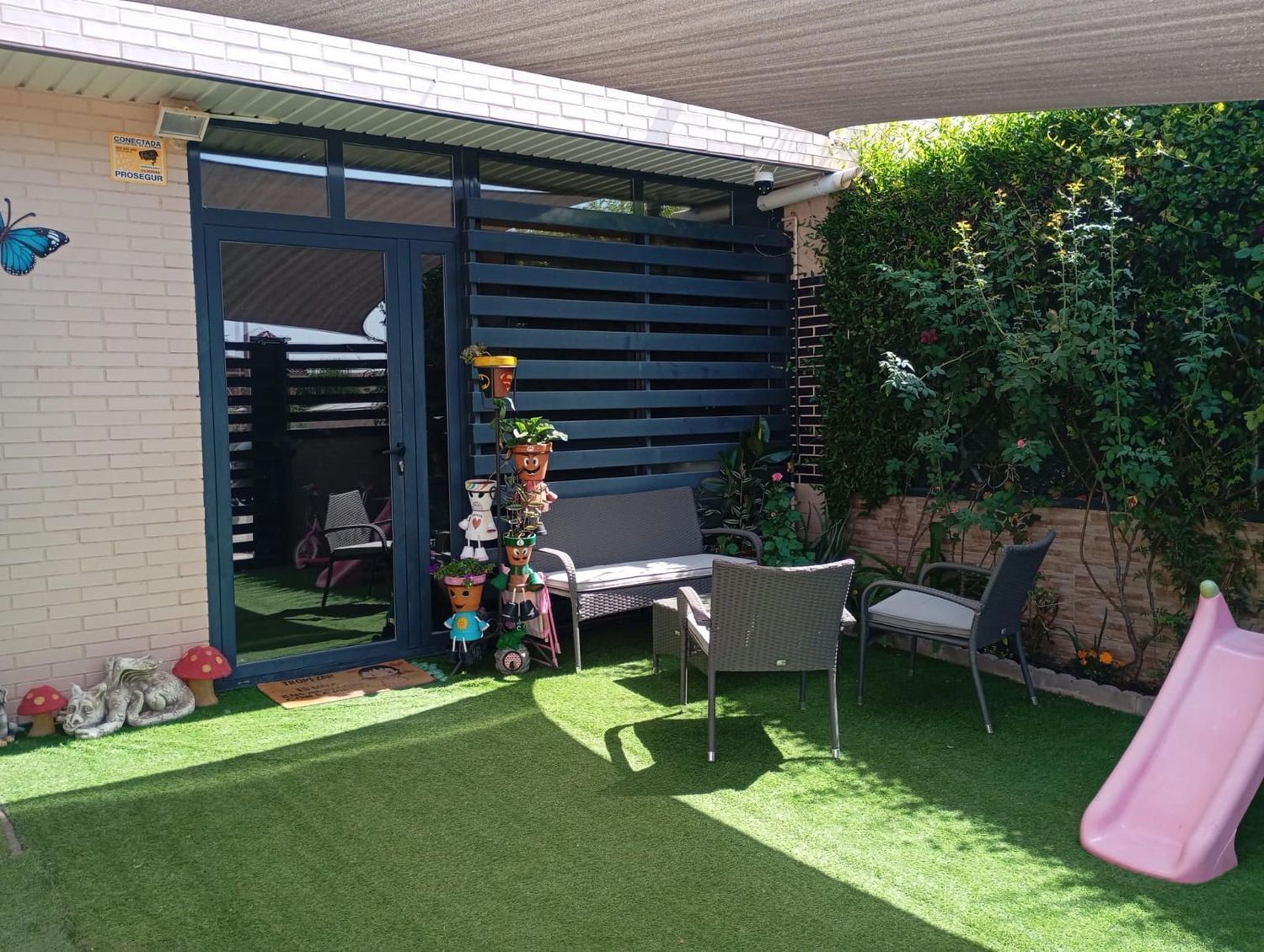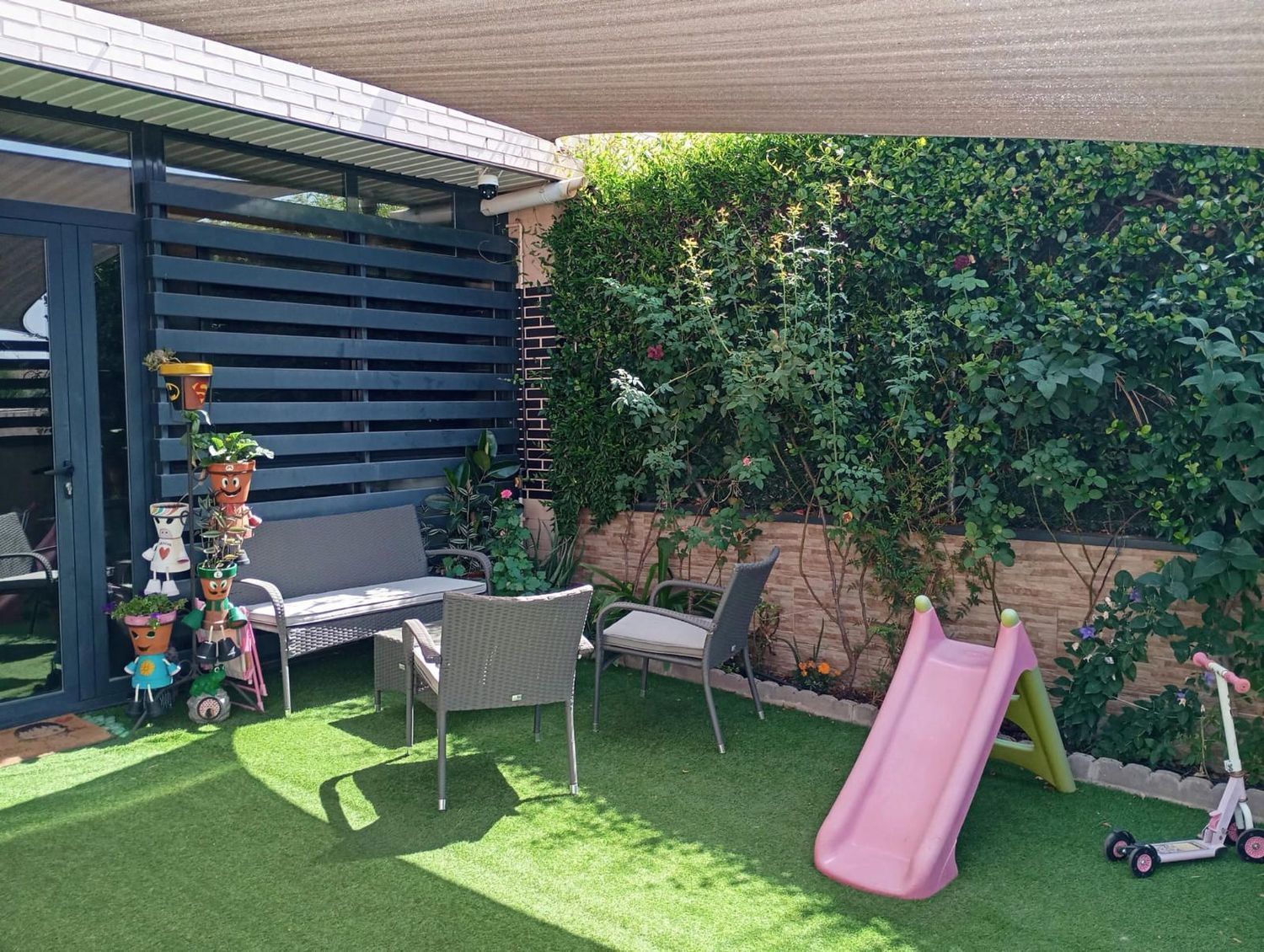 Parcela orientada al sureste con jardín trasero de 65 m², delantero de 36 m² y trastero de obra (3x2 m).