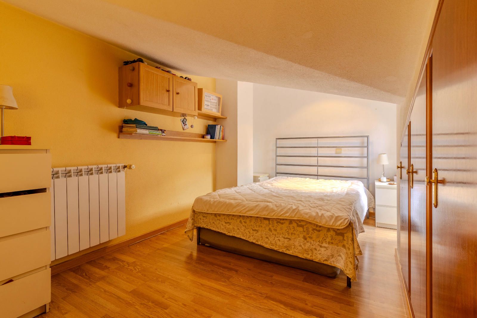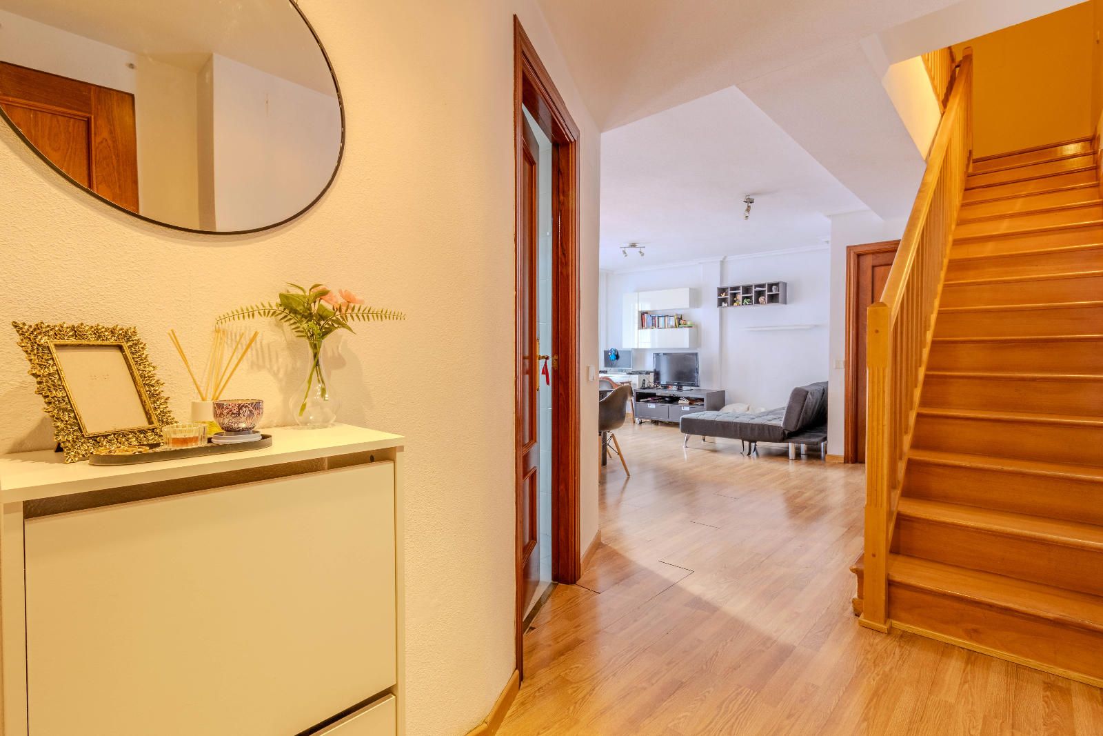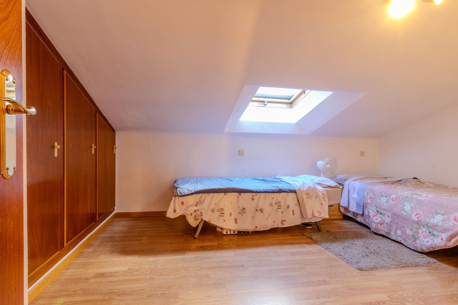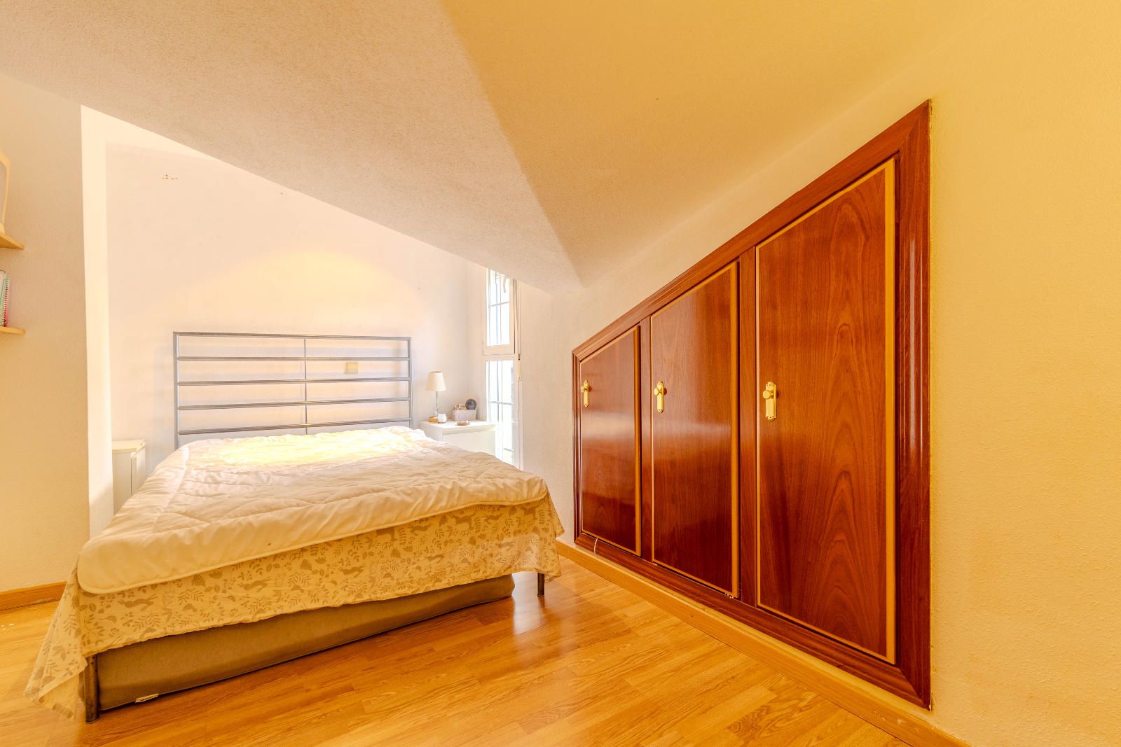 Las escaleras, situadas estratégicamente junto a la entrada, optimizan el espacio y conducen a la planta superior, donde se encuentran los dormitorios. En la segunda planta, las habitaciones con techos abuhardillados aportan carácter y calidez al conjunto, además de contar con armarios empotrados que aprovechan al máximo cada metro disponible. El baño completo, práctico y bien distribuido, da servicio a esta zona de descanso familiar.