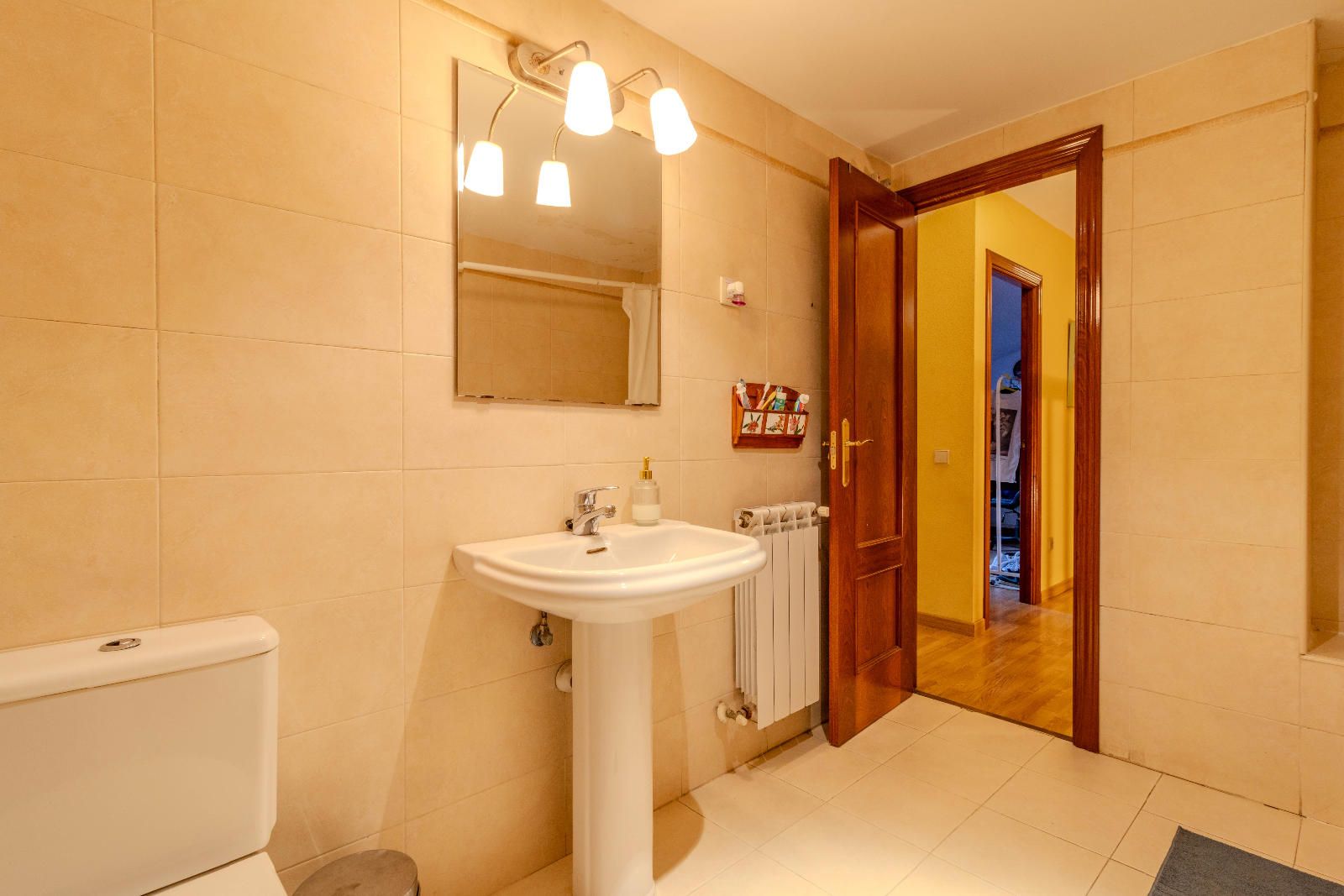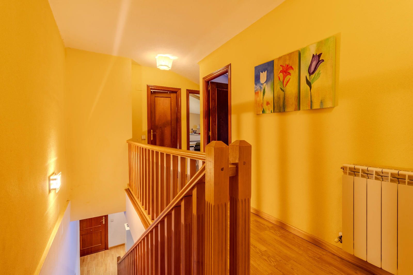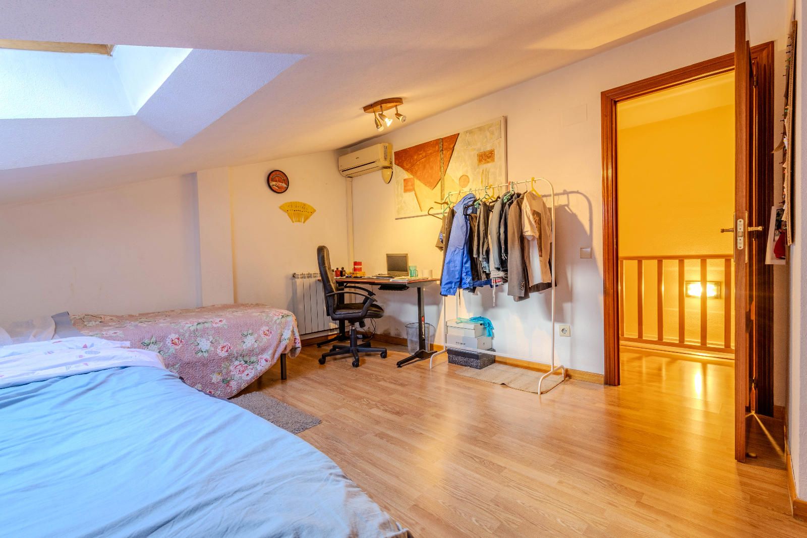 Las escaleras, situadas estratégicamente junto a la entrada, optimizan el espacio y conducen a la planta superior, donde se encuentran los dormitorios. En la segunda planta, las habitaciones con techos abuhardillados aportan carácter y calidez al conjunto, además de contar con armarios empotrados que aprovechan al máximo cada metro disponible. El baño completo, práctico y bien distribuido, da servicio a esta zona de descanso familiar.
