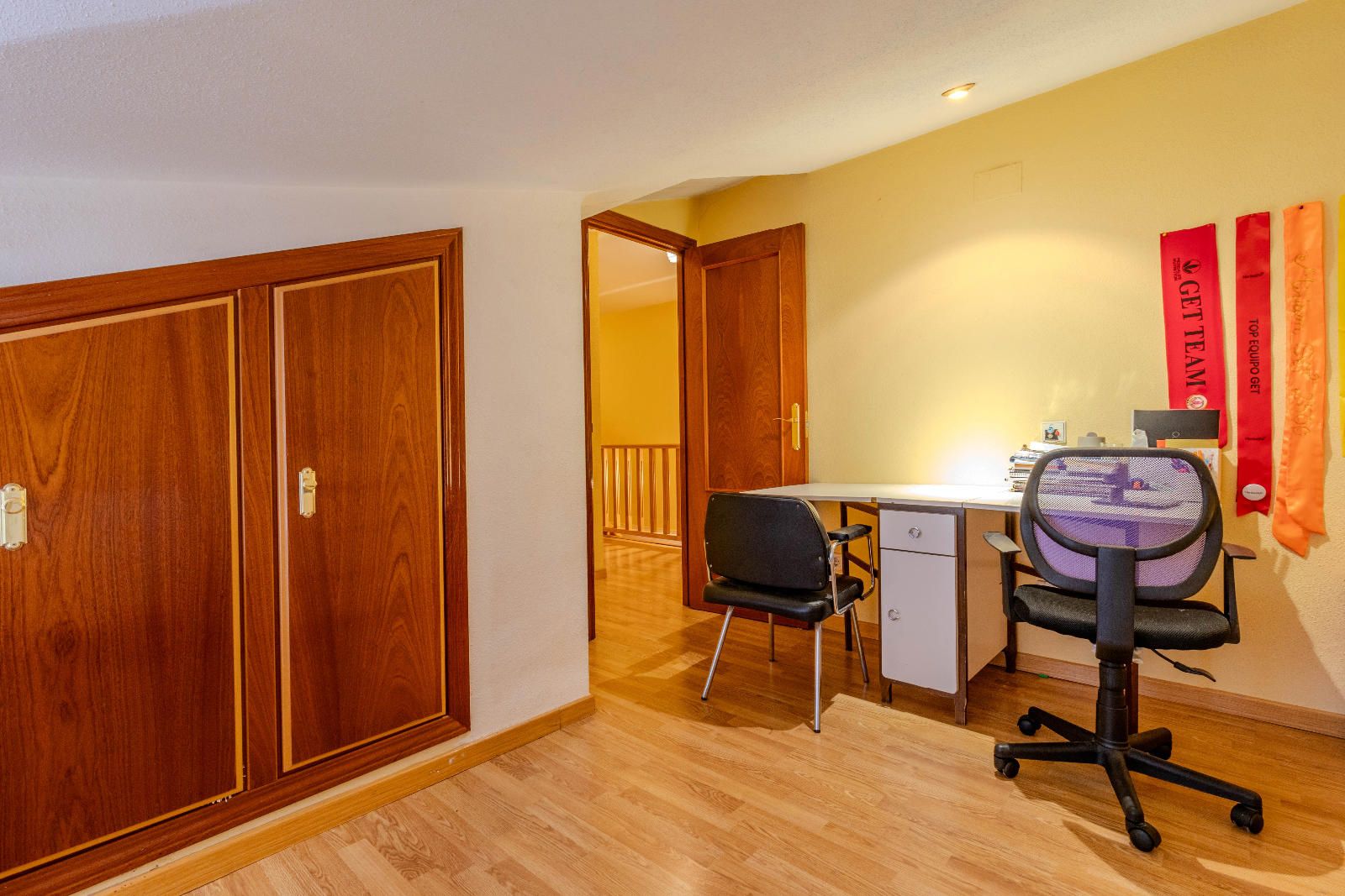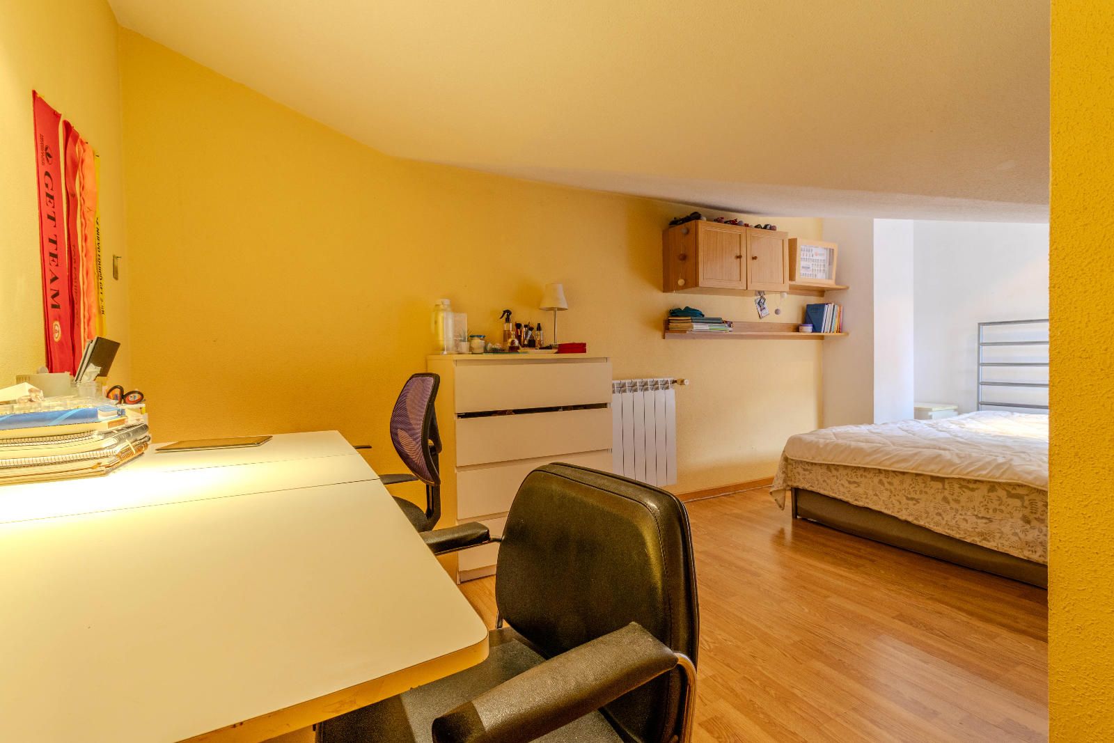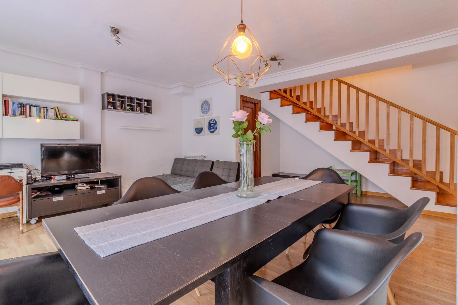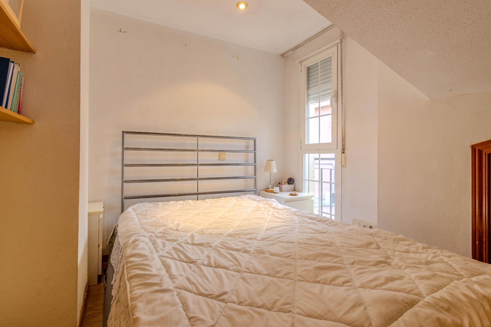 Las escaleras, situadas estratégicamente junto a la entrada, optimizan el espacio y conducen a la planta superior, donde se encuentran los dormitorios. En la segunda planta, las habitaciones con techos abuhardillados aportan carácter y calidez al conjunto, además de contar con armarios empotrados que aprovechan al máximo cada metro disponible. El baño completo, práctico y bien distribuido, da servicio a esta zona de descanso familiar.